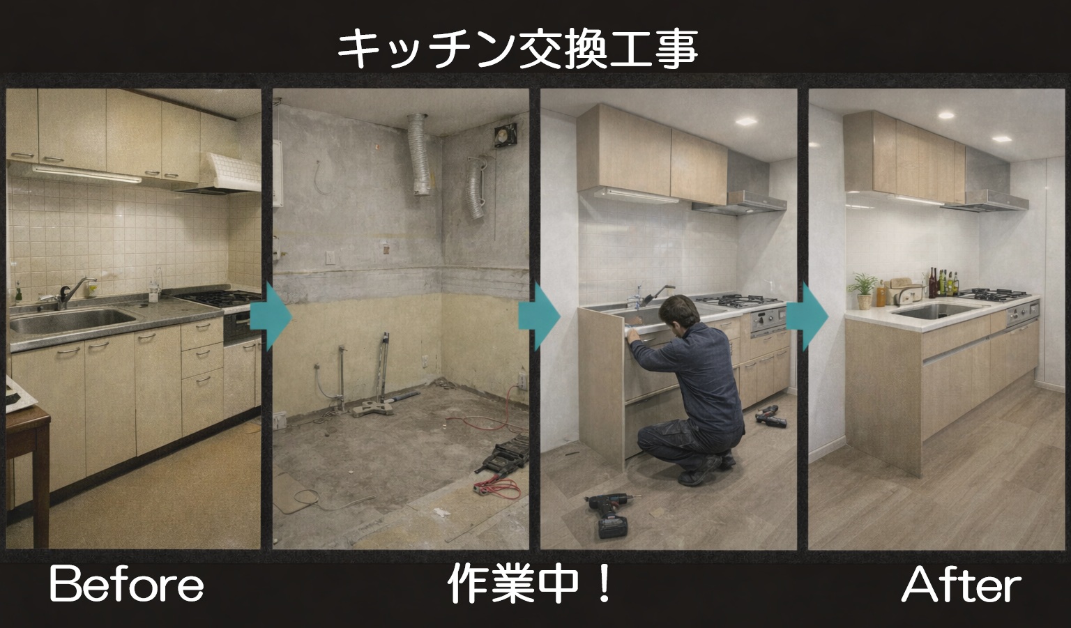工事ではまず既存キッチンを丁寧に解体・撤去し、給排水管やガス管、電気配線の位置や状態を確認します。その後、新しいキッチンを搬入・組立し、水平調整を行いながらしっかりと固定。設備機器(コンロ・換気扇・食洗機など)を接続し、動作確認まで行います。必要に応じて、床や壁の内装補修も同時に施工します。キッチン交換は、見た目だけでなく「使いやすさ」を大きく変える工事です。